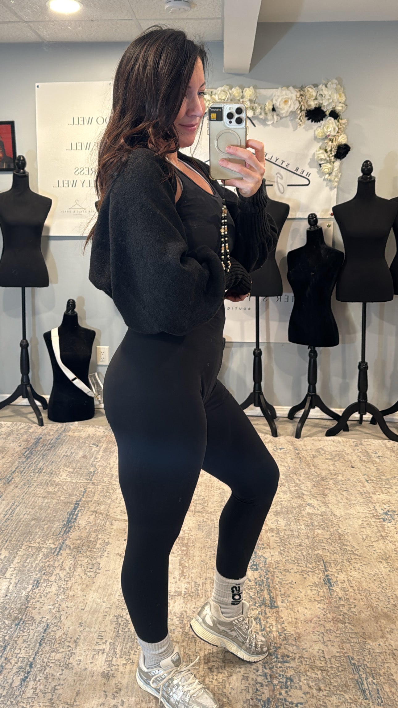 The Collier Shrug Sweater is a versatile layering piece that effortlessly transitions from gym to everyday wear. This elegant black shrug drapes beautifully over the shoulders, adding polish to athletic basics like sports bras and tank tops, while instantly elevating casual leggings. Whether you're heading to a workout or running errands, this sophisticated layer provides comfort and style without compromising movement. Perfect for those moments when you need an extra touch of refinement.